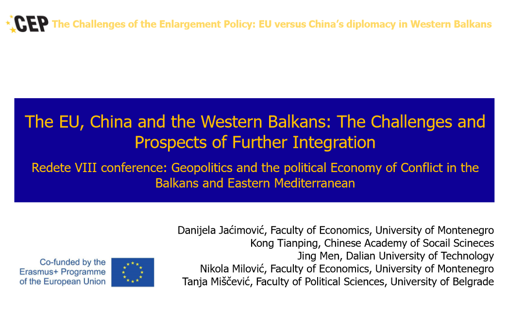 Part of the research done during the realization of the project - The EU, China and the Western Balkans: The Challenges and Prospects of Further Integration, was presented at the regional conference „Geopolitics and the political Economy of Conflict in the Balkans and Eastern Mediterranean“. The conference was organized in Niš (Serbia) jointly in University of Niš, Faculty of Economics and Science-Technology Park Niš, from 3rd to 5th September, 2021.